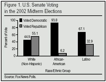- There is no "Latino" voting bloc, as such — after controlling for party identification, income, and education, there is no difference between Latino voting and the voting pattern of non-Hispanic whites in either the Senate or gubernatorial races of 2002. This is not true of African Americans, who are a distinctive voting bloc even after controlling for education, income, and party identification.