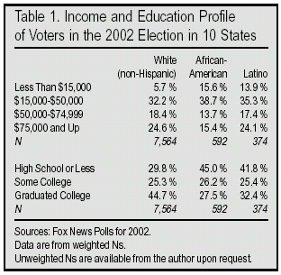 For instance, Table 1 shows that a whopping 24 percent of Latino voters showing up at the polls earned above $75,000 — about the same proportion as non-Hispanic white voters, and far wealthier than the African Americans who voted. Yet it doesn’t require intimate familiarity with the 2000 census to know that in the general (citizen) population Hispanic earnings lag well beyond the earnings of non-Hispanic whites. Latino voters in the 2002 election were far from representative of the broader Hispanic community of eligible voters.