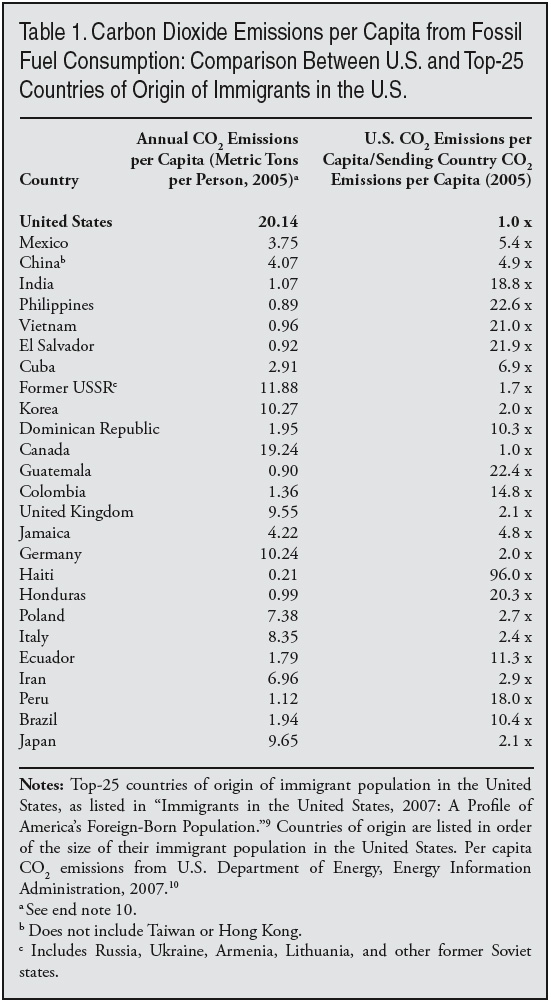 The small body of research on immigration’s environmental impact in the United States has tended to focus on the effects of the population growth induced by immigrants and their U.S.-born offspring on the U.S. environment alone.1 In contrast, the present study attempts to quantify the direct contribution of immigrants in the United States to growing U.S. and global carbon dioxide (CO2) emissions. Since American emissions per capita are much higher than almost all of the immigrant-sending countries, immigration to the United States has significant implications for world-wide emissions.