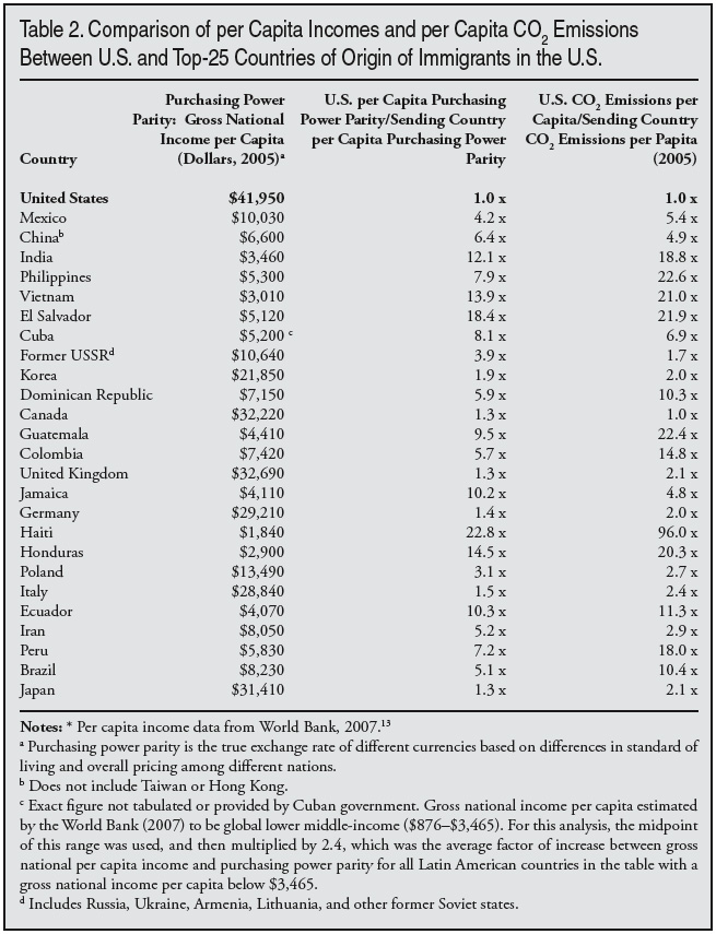 What is most important about the table is that it shows that almost all of the top immigrant-sending countries to the United States have dramatically lower CO2 emissions per capita. By and large, people who migrate to the United States aspire to improve their material standard of living, and as noted above, this generally entails a higher level of energy consumption and, thus, CO2 emissions. If Table 1 indicated that U.S. CO2 emissions per capita were lower or even the same as the primary immigrant-sending countries, it is likely that immigration to the United States would have little or no effect on world-wide GHG emissions, although total U.S. emissions would still rise dramatically. But, in fact, the United States has much higher per capita CO2 emissions — five times higher — than the world average (20 vs. four metric tons annually). As a result, immigration to the United States has significant implications for world-wide CO2 emissions.