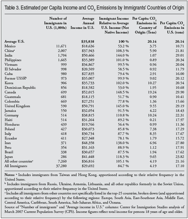 The final row of Table 3 shows that the average per capita CO2 emissions for all immigrants in the United States was 4.19 metric tons in their sending countries. In the United States, those same immigrants had estimated emissions of 17.1 tons, about four times as high as the average per capita emissions in their countries of origin. Thus, the 37.3 million legal and illegal immigrants now living in the United States in 2007 produced about four times as much CO2 as they would have had they stayed in their home countries.