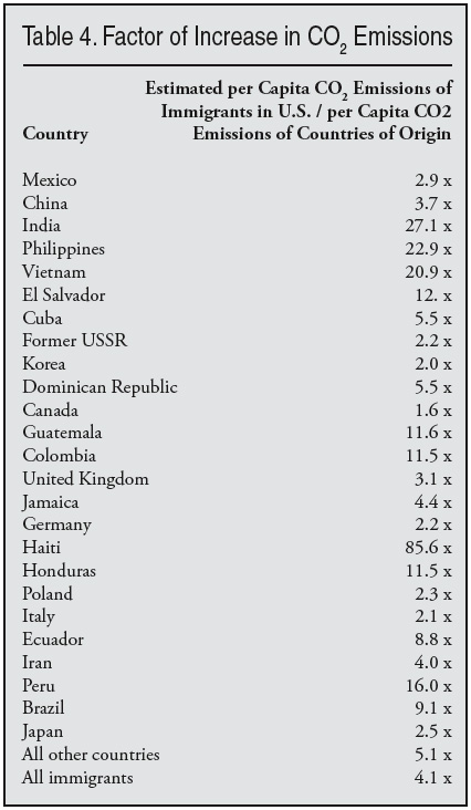 Table 4 shows by how many times immigrants in the United States increased their per capita CO2 emissions relative to average annual per capita emissions in their countries of origin. It is a measure of just how much emissions have increased because of immigration to the United States.