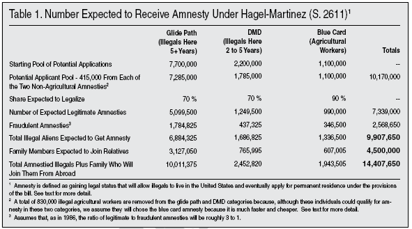 The Hagel-Martinez bill is the most far-reaching immigration bill ever conceived by Congress. In addition to the amnesty provisions of the bill, it dramatically increases green cards in the future and changes immigration law in numerous other ways. This Backgrounder focuses only on the size and scope of the three amnesty categories in the legislation. We estimate that if the bill becames law, almost 10 million illegal aliens will legalize, 2.6 million of whom will do so fraudulently. In addition, nearly 4.5 million family members of illegal immigrants currently living abroad will be allowed to join their newly legalized relatives for a total of 14.4 million people who will benefit from the bill’s amnesty provisions. We also estimate that, of the 14.4 million who gain legal status, some 13.5 million will eventually be awarded Lawful Permanent Residence (LPR), which means they can stay in the country as along as they wish and apply for citizenship.