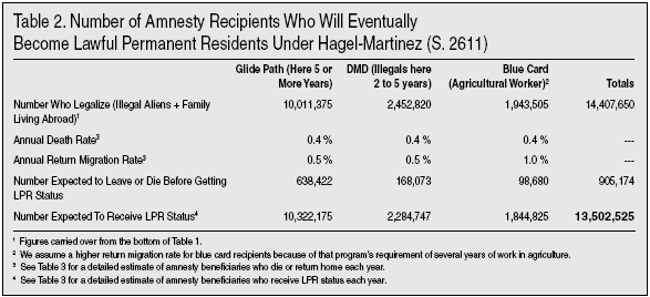 Share Expected to Get LPR Status. Of the 14.41million illegal immigrants and their family members expected to legalize under Hagel-Martinez, we expect that 13.5 million will ultimately receive LPR status. Table 2 shows our estimates for the share of each amnesty category that will eventually become permanent residents (LPR status, also referred to as having a green card). In short, we estimate that roughly 550,00 illegal aliens who initially legalize will eventually die or return home prior to receiving a green card and 350,000 of their relatives who will do the same. These estimates are based on an annual return migration rate of .5 percent and a death rate of .4 percent.11 We apply these return-migration and death rates until the amnestied individual receives his or her green card.