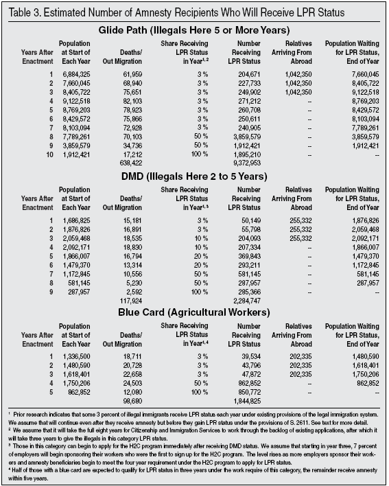 As shown in Table 3, the family members of legalized illegal aliens are expected to arrive from abroad in the first three years after S. 2611 goes into effect, with one-third arriving each year. Death and return-migration are shown in the table. The bottom of the table reports the total number expected to get LPR status. In the long run, half to three-fourths of the 13.5 million who receive LPR status can be expected to eventually get citizenship. However, the share that will become citizens is beyond the scope of this analysis.