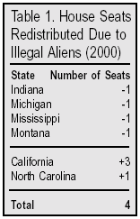 Impact of Illegal Aliens. Table 1 shows which states gain and which states lose when illegal aliens are taken out of the 2000 Census counts. The table shows that four states each had one fewer seat because of the presence of illegal immigrants. Indiana, Michigan, and Mississippi each lost one seat in the House, and Montana failed to gain a seat it otherwise would have gained because of the inclusion of illegal aliens in the 2000 Census. California picked up three seats because of illegal aliens and, surprisingly, North Carolina also gained an extra seat. Although the INS estimates that North Carolina is home to only 3 percent of the nation’s total illegal population, the state was right on the threshold of gaining an additional seat; the presence of nearly 200,000 illegal aliens allowed it to be awarded an additional seat.