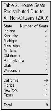 - The presence of all non-citizens in the Census redistributed a total of nine seats. The term "non-citizens" includes illegal aliens, legal immigrants, and temporary visitors, mainly foreign students and guest workers. In addition to the four states that lost a seat due to the presence of illegal aliens, Oklahoma, Pennsylvania, Wisconsin, Kentucky, and Utah each had one fewer seat than they otherwise would have.