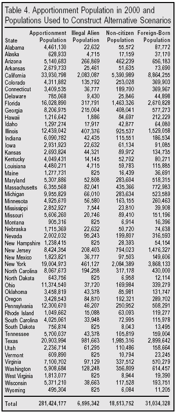 To estimate the impact of immigration on apportionment in 2000, three separate population scenarios are used. The first excludes the illegal alien population from each state’s Census count; the second excludes all non-citizens (illegal aliens, lawful permanent residents, and long-term temporary visitors); the third scenario excludes all of the foreign born, including naturalized U.S. citizens. In each case, once the target population was removed we then recalculated the distribution of House seats that would result. By doing so, we may then determine the impact of immigration on the size of each state’s delegation in the House of Representatives. Table 4 (p. 6) at the end of this report shows the apportionment population and the illegal, non-citizen, and total foreign-born populations by state in 2000.