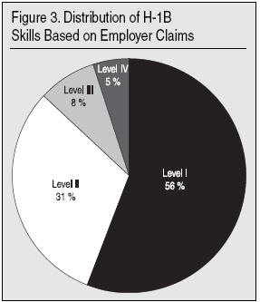 An examination of the skill levels reported on the LCAs reveals that employers claim that the majority of their H-1B workers are entry level. In stark contrast to claims that the H-1B program is used for "highly-skilled" workers, employers claim the majority are less-skilled workers. Figure 3 shows the distribution of employer skill claims on LCAs.