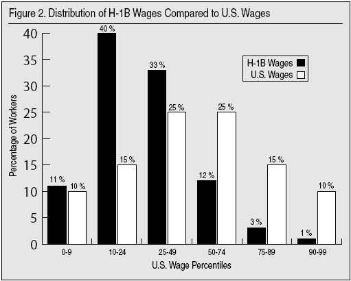 - The reported wages for 84 percent of H-1B workers were below the median U.S. wage; 51 percent were in the bottom 25th percentile of U.S. wages.