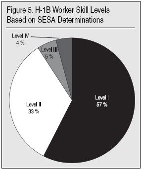 - Very few H-1B workers are "highly-skilled." Employers who used the Department of Labor’s skill-based prevailing wage system classified most workers (56 percent) as being at the lowest skill level (Level I) as did most State Employment Security Agency (SESA) wage determinations (57 percent). This suggests that most H-1B computer workers are low-skilled workers who make no special contribution to the American economy, or that employers are deliberately understating workers’ skills in order to justify paying them lower salaries.