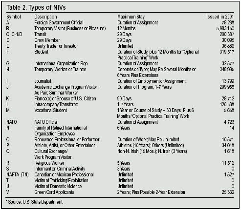 - In 2001, the United States issued 1.2 million long-term NIVs, an even higher number than were issued green cards (1.1 million). In some categories, their stay may be virtually unlimited.