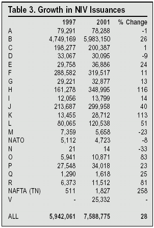 However, some other categories are seeing particularly dramatic spurts in use. These categories are nearly all employment-related (H, J, L, O, R, NAFTA). Table 3 is an analysis of the change in the number of NIV issuances by category between 1997 and 2001.