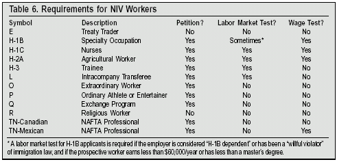 The application process in all of the employment-related NIV categories is more complex and requires an extensive amount of documentation compared to other NIV categories. Most require the applicant’s employer to file a petition, usually with the INS, that must be approved before the visa can be issued. Some require the employer to obtain approval from the Department of Labor after guaranteeing that the employer will pay the "prevailing wage" to the worker. However, most employment NIVs, unlike employment-based Immigrant Visas (IVs), do not require the employer to demonstrate that he cannot find U.S. workers (the labor market test). Table 6 summarizes the employment-based NIV categories and the requirements.