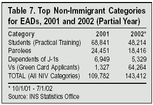 2 These figures include NIVs issued in the following categories: E, H, L, O, P, Q, R, TN, 1/2 of all J, and the number of new EADs issued in 2001.
