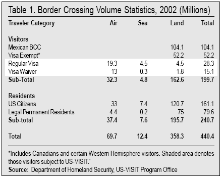 For reasons that have yet to be clearly articulated, DHS decided to designate only a very small subset of foreign visitors -- those Canadians who require a visa (mainly students and guestworkers) and those Mexicans entering for long stays or traveling beyond the immediate border area -- for enrollment (See Table 2). Numbering about three million a year, these individuals represent less than 3 percent of all foreign visitors using these ports.6 Ironically, those land crossers covered by US-VISIT probably pose the least risk for terrorism or overstay, since they have made an effort to comply with the law by voluntarily announcing their interest in staying for an extended period, thus inviting extra scrutiny.