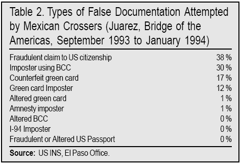 In addition to genuine card holders using the cards to work illegally, it is common practice for the genuine cards to be used by imposters. According to INS statistics cited in the Bean report, BCC imposter fraud is one of two main kinds of document fraud detected at the southern ports of entry (see table 2). 9 From page 116 of the report: "While almost no one appears to attempt to cross with an altered or fraudulent BCC, a fair number of people seem to attempt to cross with someone else's card, presumably betting on lax inspection of the photograph it bears on the part of INS personnel at the port of entry."