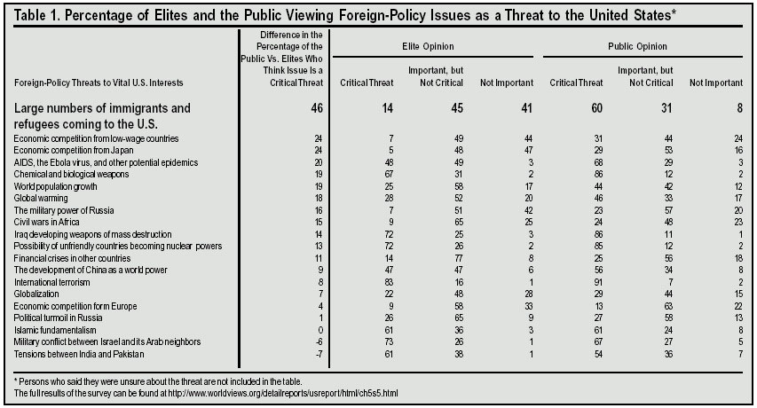 - The poll results indicate that there is no other foreign policy-related issue on which the American people and their leaders disagreed more profoundly than immigration. Even on such divisive issues as globalization or strengthening the United Nations, the public and the elite are much closer together than they are on immigration.