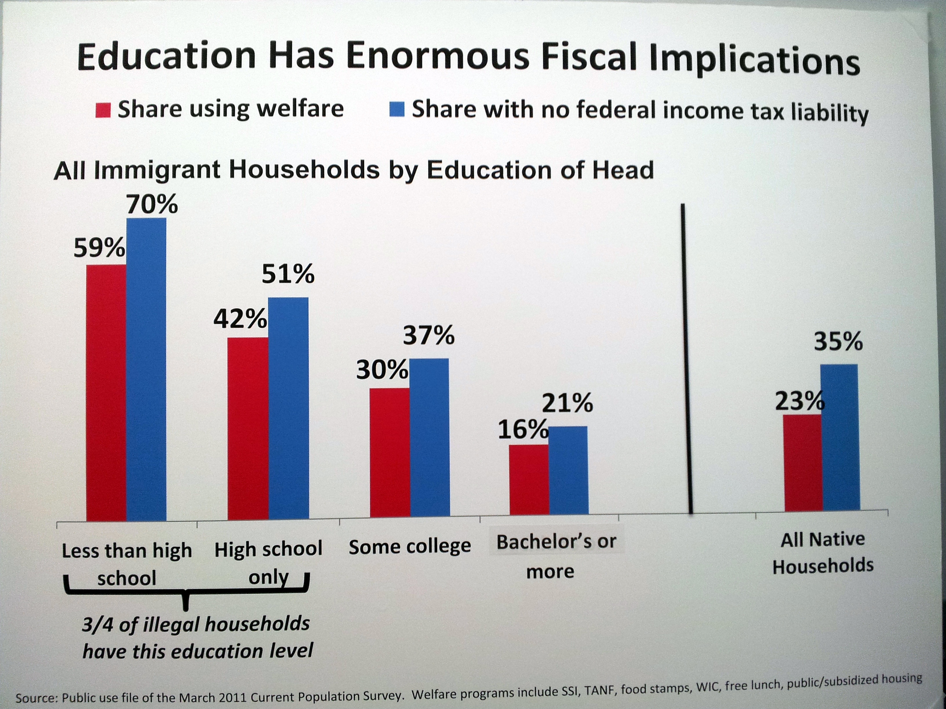 The final panelist to provide substantive testimony was CIS's Steven Camarota. It is also worth watching in full at 6:15:00. Mr. Camarota started with a basic fact: "In the modern American economy, those with relatively little education, immigrant or native, earn modest wages, on average, and by design pay modest taxes. Their lower income also means they often benefit from welfare and other means-tested programs. As a result, the less-educated in general, immigrant or native, use more in services than they pay in taxes." He explained that the relationship between educational attainment and net fiscal impact is the key to understanding the fiscal impact this amnesty bill would have. Mr. Camarota then noted research by the National Research Council in 1996 which found that an immigrant who arrives in the United States without a high school education will use $89,000 more in services than he pays in taxes during his lifetime (which would be larger, adjusted for inflation). For an immigrant who comes with only a high school education, the study found that the net fiscal drain is $31,00. Mr. Camarota explained, "In the case of illegal immigrants the vast majority has modest levels of education, averaging only about 10 years of schooling. This fact is the primary reason illegal immigrants are a fiscal drain, not their legal status." He continued, "My own research indicates that if we were to legalize illegal immigrants and they began to use services and pay taxes like legal immigrants with the same level of education, the net fiscal cost at the federal level would roughly triple because they remain unskilled." Mr. Camarota then referred to his chart, below: