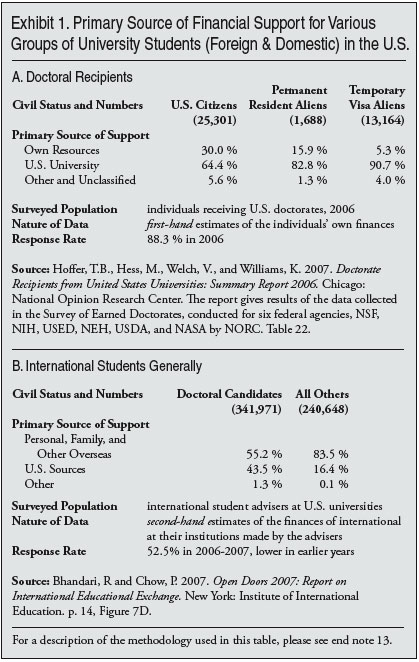 As the exhibit shows, the Summary Report has different findings on the question for three subsets of doctoral recipients; U.S. citizens say that the primary source of their funding, in 30.0 percent of the cases, came from their own resources. Comparable findings were 15.9 percent for permanent resident aliens (greencard holders), and only 5.3 percent for those with temporary visas.