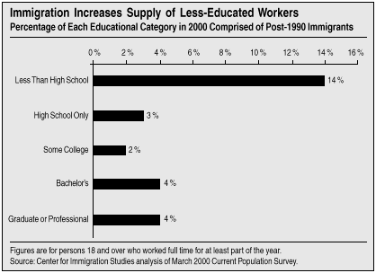 The difference is that the labor market today is much different than it was at the turn of the century, when we desperately needed low skilled workers, as opposed to today, when the low skilled labor market is increasing slightly, but not very much that is, the number of jobs for low skilled workers and the supply, however, of low skilled workers is increasing dramatically, due largely to immigration, since about 40 percent of the adult foreign-born population do not have a high school diploma and pretty close to 60 percent have a high school diploma or less. That is, they're heavily concentrated in the low skilled labor market.