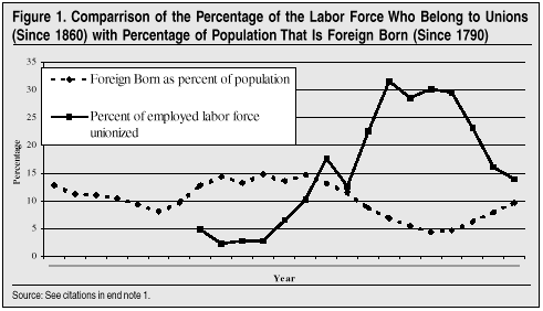 Now, in your packet you have an excerpt of Dr. Briggs' new book. As I said, the book explores American immigration and unions. In general, Dr. Briggs finds that immigration tends to weaken unions. He shows that historically unions have generally done best when immigration was low and have generally done worst when immigration was high.