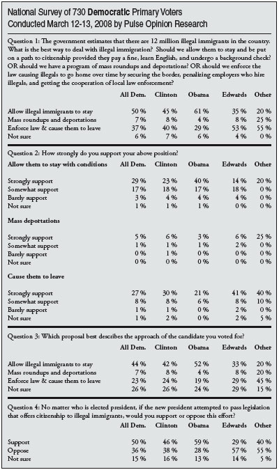 WASHINGTON (March 31, 2008) –A new poll using neutral language finds that primary and caucus voters have little knowledge of candidates’ immigration positions. The results also show that voters often do not share their candidate’s position.