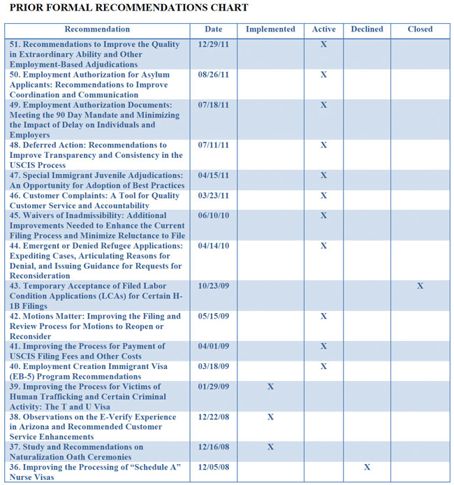 To summarize, the Ombudsman has made 16 formal recommendations to the head office of USCIS since December 5, 2008, and only three of them have been implemented. The following table from the report shows first part of its summary: