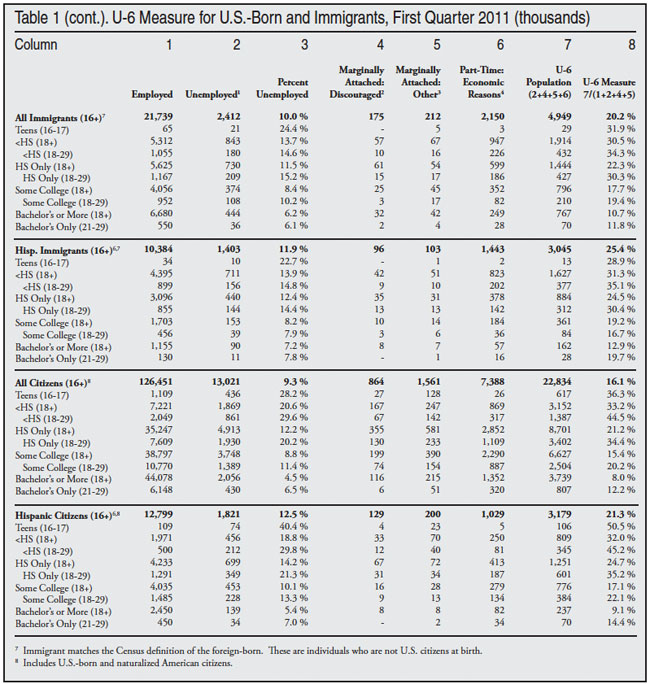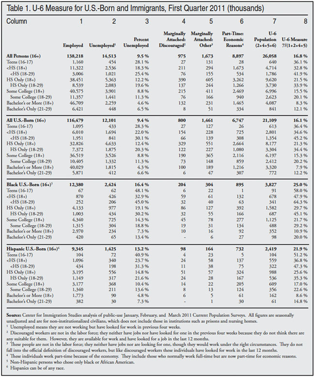 Unlike the figures published by the Department of Labor, this report provides a detailed breakdown of employment for U.S.-born and foreign-born workers by age and education. The employment situation for U.S.-born workers and citizens (foreign- and U.S.-born) remained bleak in the first quarter of 2011, particularly for the young and the less-educated, who are the most likely to compete with illegal immigrants. The findings stand in stark contrast to President Obama’s recent proposal to allow illegal immigrants to remain permanently in their jobs and to increase the number of legal immigrants allowed into the country each year. The president seems to believe that jobs are plentiful. (All figures are seasonally unadjusted.)