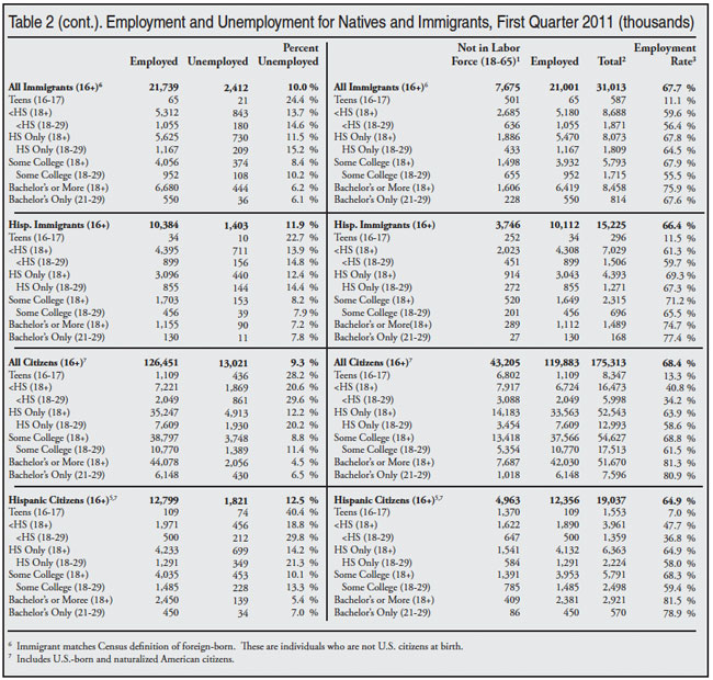 The government publishes employment statistics that are both seasonally adjusted and unadjusted from the survey. The figures in this analysis are seasonally unadjusted. Unadjusted figures are computationally simpler and easier for other researchers to replicate. In general, BLS does not provide separate estimates for the foreign-born (immigrants) and the native-born broken down by characteristics like education, race, and age. However, all CPS respondents are asked these questions. The Census Bureau defines the foreign-born as persons who are not U.S. citizens at birth, which includes naturalized citizens, legal immigrants who are not citizens (green card holders), temporary visitors and workers, and illegal immigrants. All figures for the total U.S. population (age 16+) at the top of Tables 1 and 2 match those from the BLS.