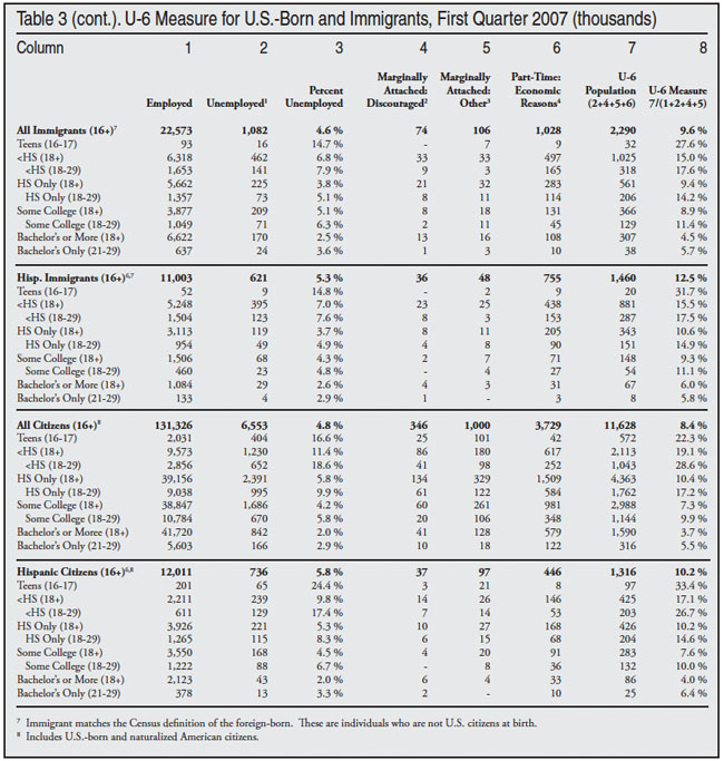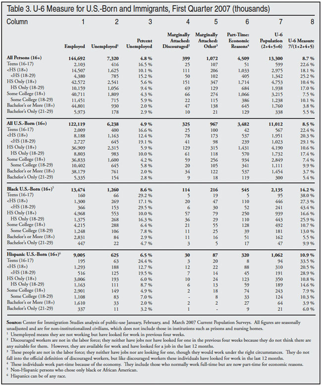 Not Working. The U-3 and U-6 measures both deal with those who express some interest in working. Some of those included in the U-6 measure are considered to be outside of the labor force because they have not looked for a job in the last four weeks. Thus if someone has not looked recently for a job and has given up entirely looking for work, then he or she would not be part of the U-3 or even the U-6 measure of unemployment. The right side of Table 2 reports the share of working-age adults (18 to 65) not in the labor force. It also shows the number holding a job. Table 2 shows that in first quarter of 2011, nearly 40.4 million U.S.-born adults were not in the labor force — not working or looking for work. If we include the 11.3 million U.S.-born adults (18 to 65) who are unemployed, the total number not working would be 51.7 million, an increase of 10.1 million since the first quarter of 2007.