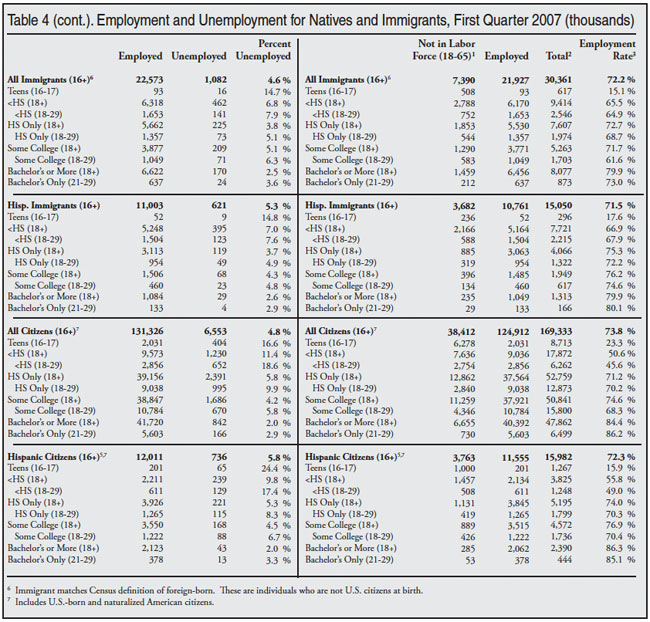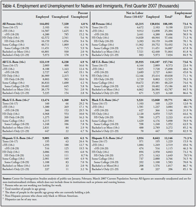 We can see the increase in the number not working by comparing Table 2 to Table 4. Table 4 shows the same information as Table 2 except that it is for the first quarter of 2007, before the recession began. (Table 3 (pp. 10-11) shows the same information as Table 1 for the first quarter of 2007.) There would seem to be a huge pool of legal workers available in the United States. Table 4 shows that in the first quarter of 2007, 73.6 percent of U.S.-born working-age adults were employed. In 2011 it was 68.1 percent. If we returned to the 2007 employment rate, roughly 10 million more U.S.-born adults would be working.