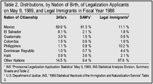 The distributions, by nation of birth, of legalization applicants, on May 9, 1989, and of legal immigrants in fiscal year 1986 are shown in Table 2.