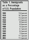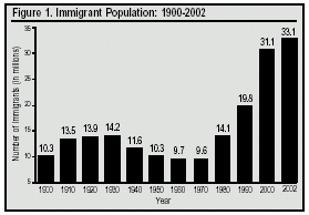 While immigration has played an important role in American history, the level of immigration and the size of the immigrant population have varied considerably. Figure 1 shows the number of immigrants living in the United States over the course of the last 100 years. The 33.1 million immigrants residing in the United States in 2002 are by far the most ever recorded. Even during the great wave of immigration at the turn of the century, the immigrant population was less than half what it is today.