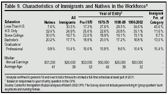 Immigrants now comprise 14.6 percent of the nation’s total workforce.6 This is somewhat higher than the immigrant share of the total U.S. population (1.5 percent) because, in comparison to natives, a slightly higher percentage of immigrants are of working age. Table 9 reports educational attainment and other characteristics of immigrants and natives in the workforce. The table shows that in 2002, 30 percent of immigrants who worked full time at least part of the year did not have a high school diploma, and of those who arrived in the 1990s, the figure is 35 percent. In comparison, slightly less than 8 percent of natives lacked a high school education. This difference in the educational attainment of immigrants and natives has enormous implications for the social and economic integration of immigrants into America society. There is no single better predictor of economic success than education, and the fact that so many adult immigrants lack a high school degree means their income, poverty rates, welfare use, and other measures of economic attainment are likely to lag far behind natives. The table also shows that about the same percentage of immigrants and natives have graduate or professional degrees.