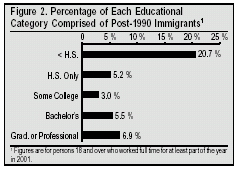 The large number of immigrants with low levels of education means that immigration policy has dramatically increased the supply of workers with less than a high school degree, while increasing other educational categories more modestly. The last column in Table 9 shows the portion of each educational category composed of immigrants. While immigrants comprise about 15 percent of the total workforce, they comprise more than 40 percent of the high school dropouts in the workforce. Figure 2 shows the share of workers in each educational category comprised of immigrants who arrived since 1990. The figure shows that recent immigration has fundamentally altered the supply of unskilled workers by increasing the number of dropouts in the workforce by 21 percent; however, recent immigration has increased the supply of workers in other educational categories by between 3 and 7 percent. This means that any effect immigration may have on the wages or job opportunities of natives will disproportionately affect less-skilled workers, who are already the lowest-paid workers.