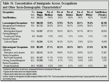 Table 10 reveals that only 25 percent of natives are employed in occupations that have high concentrations of immigrants. This suggests that most natives are not in competition with immigrants.8 However, as Table 10 shows, high-immigrant occupations pay an average of only 53 percent of what low-immigrant occupations pay. Additionally, high-immigrant occupations have unemployment rates that tend to be significantly higher than low-immigrant occupations. By itself, this does not necessarily mean that immigrants have lowered the wages or increased unemployment in these occupations. What it is does mean, however, is that any negative effect from immigration will likely fall on the 25 million native-born workers who already have the lowest wages and the highest unemployment. Table 10 also shows that 40 percent of native-born blacks work in high-immigrant occupations, compared to only 22 percent of whites. This means that blacks are much more likely to be affected by any decline in wages or benefits resulting from immigrant-induced increases in the supply of labor.