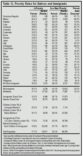 Based on the March 2002 CPS, 16.1 percent of immigrants compared to 11.1 percent of natives lived in poverty in 2001 (poverty statistics are based on annual income in the year prior to the survey). Like the income figures discussed above, over time immigrants do make significant progress. The poverty rate is 19.9 percent for immigrants who indicated they entered between 1990 to 2002, 13.8 percent for 1980s immigrants, and 11.7 percent for 1970s immigrants. Table 12 reports poverty rates for persons from the top-25 immigrant-sending countries. The data indicate that there is an enormous variation in poverty rates among immigrants from different countries. For example, the 25.8 percent poverty rate for Dominicans is more than five times that of persons from Poland or the Philippines. The last column in Table 12 shows the proportion of persons 21 years of age and older from each country who have not completed high school. These educational data indicate that those countries that have the highest percentage of adults without a high school education also tend to have the highest poverty rates.