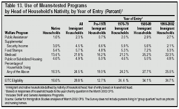 Table 13 shows the percentage of immigrant- and native-headed households in which at least one member of the household receives public assistance (including Temporary Assistance to Needy Families and state- administered general assistance programs); Supplemental Security Income (SSI), which is for low-income elderly and disabled persons; Food Stamps; Medicaid (health insurance for those with low incomes); and subsidized or government-owned housing. Table 13 indicates that even after the 1996 welfare reforms, which curtailed eligibility for some immigrants, immigrant welfare use remains higher than that of natives for most programs and entering cohorts after 1970. In fact, the year of entry data suggest that in some cases immigrant welfare use actually rises over time as they "assimilate" into the welfare system.