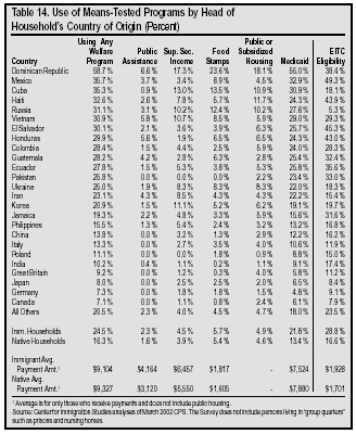 While immigrants’ welfare use is higher than natives’, Table 13 shows that most households, immigrant or native, do not use means-tested programs. On the other hand, even though most of the population does not use welfare, for 2001 the total costs of just the first four programs listed in Table 13 was more than $90 billion, and Medicaid alone costs an additional $210 billion. Moreover, there are other means-tested programs not listed in the table that are linked to those reported in Table 13. For example, 15 percent of immigrant households reported having at least one child receiving subsidized school lunches, compared to only 6 percent of native households. Finally, there is the question of whether native use of welfare is the proper yardstick by which to measure immigrants. Some may reasonably argue that because immigration is supposed to benefit the United States, our admission criteria should, with the exception of refugees, select only those immigrants who are self-sufficient.