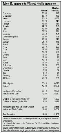 Table 15 reports the percentage of immigrants and natives who were uninsured for all of 2001. The table shows that lack of health insurance is a significant problem for immigrants from many different countries, including countries that tend to have lower poverty rates and higher education levels. The lower portion of Table 15 reports the percentage of immigrants and their U.S.-born children (under 18) who are uninsured. Almost 30 percent of immigrants and their children lack health insurance, compared to 12 percent of natives. The large percentage of immigrants and their children without insurance has significantly increased the overall size of the uninsured population. Immigrants and their U.S.-born children account for 12.8 million or almost 31 percent of uninsured persons in the country, double their 15.2 percent of the share of the overall population. The high percentage of immigrants without health insurance is even more striking when one recalls from Table 13 that immigrant households were more likely to use Medicaid. The low rate of insurance coverage associated with immigrants is primarily explained by their much lower levels of education. Because of the limited value of their labor in an economy that increasingly demands educated workers, many immigrants hold jobs that do not offer health insurance, and their low incomes make it very difficult for them to purchase insurance on their own.