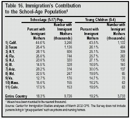 In the last few years, a good deal of attention has been focused on the dramatic increase in enrollment experienced by many school districts across the country. All observers agree that this growth has strained the resources of many school districts. While it has been suggested that this increase is the result of the children of baby boomers reaching school age (the "baby boom echo"), it is clear from the CPS that immigration policy accounts for the dramatic increase in school enrollment. Table 16 shows that there are 9.7 million school-age children of immigrants (ages 5 to 17) in the United States, accounting for 18.3 percent of the total school age population. While fewer than one-third of these children are immigrants themselves, the use of public education by the U.S.-born children of immigrants is a direct consequence of their parents having been allowed into the country. The children of immigrants account for such a large percentage of the school-age population because a higher proportion of immigrant women are in their childbearing years, and immigrants tend to have more children than natives. In addition, the effect of immigration on public schools will be even larger in the coming years because 19.3 percent of children approaching school age have immigrant mothers.