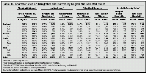Table 17 reports characteristics for immigrants by region of the country and for selected states. The first two columns report the percentage of adult immigrants and natives who lack a high school education. The table shows that in every part of the country the share of adult immigrants without a high school education is significantly higher than that of natives. The largest gap is found in Western states, where more than four times as many immigrants as natives are high school dropouts as natives. This huge gap has enormous implications for the social and economic integration of immigrants because, as already noted, there is no single better predictor of one’s economic and social status than education.