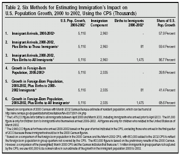 The CPS can be used to provide insight into the impact of immigration on the size of the U.S. population. Table 2 reports six different methods using the March 2002 CPS to estimate the effect of immigration on U.S. population growth since the last Census. The first column in Table 2 shows the growth in the U.S. population based on a comparison of the total population as enumerated in the 2000 Census and the March 2002 population estimate prepared by the Census Bureau. The first three rows of Table 2 use the number of immigrants who arrived in the United States in the last two years as the basis for estimating the impact of immigration on U.S. population growth. This method is possible because the CPS asks foreign-born persons what year they came to the United States. In 2002, 3.33 million immigrants in the Survey indicated that they had entered the country in 2000, 2001 and the first three months of 2002. Because those who arrived in the first three months of 2000 should have already been counted in the 2000 Census we reduce the 3.3 figure by 370,000 or three months worth of immigration to account for those who arrived in the first quarter of 2000. It is reasonable to view the 2.96 million immigrants who arrived in the last two years as the basis for estimating immigration’s effect on population growth because this flow reflects current U.S. immigration policy — both legal immigration and the level of resources devoted to controlling illegal immigration.