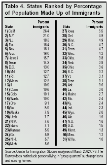Table 4 ranks states by the percentage of their populations composed of immigrants. While the rankings by "percent immigrant" are similar to those in Table 3, there are some significant differences. Because of their relatively small total populations, several states, such as Hawaii and Nevada, with high percentages of immigrants, rank lower in terms of number of immigrants.