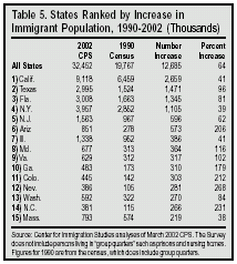 Table 5 compares the 1990 Census counts of the immigrant population with the March 2000 CPS and ranks the top 15 states by the numerical increase in their immigrant populations. While the states that had large immigrant populations in 1990 continue to account for most of the growth in the immigrant population, Table 5 shows substantial growth in the foreign-born populations in such states as Arizona, Colorado, North Carolina, and Nevada. The table also shows that immigrants have become somewhat less concentrated in the last 12 years. In 1990 the top six states accounted for 73 percent of the total immigrant population, but by 2002 these states accounted for 68 percent of the total foreign-born population in the United States.
