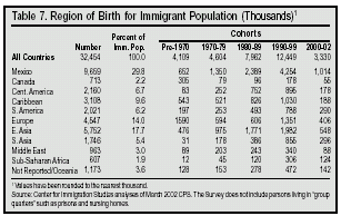An analysis by the Center for Immigration Studies of the Current Population Survey (CPS) collected in March of this year by the Census Bureau indicates that 33.1 million immigrants (legal and illegal) live in the United States, an increase of two million just since the last Census. The March CPS includes an extra-large sample of minorities and is considered one of the best sources for information on persons born outside of the United States — referred to as foreign-born by the Census Bureau.1 For the purposes of this report, foreign-born and immigrant are used synonymously.2 The questions asked in the CPS are much more extensive than those in the decennial census, and therefore it can be used to provide a detailed picture of the nation’s population, including information about welfare use, health insurance coverage, poverty rates, entrepreneurship, and many other characteristics. The purpose of this Backgrounder is to examine immigration’s impact on the United States so as to better inform the debate over what kind of immigration policy should be adopted in the future.