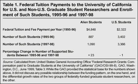 UC decided to extend this practice to federal research projects by charging the federal government a higher rate for aliens waived tuition: $14,500 for foreign students with temporary visas, but only $4,400 for U.S. citizens and green-card holders.1 This subject was dealt with somewhat obliquely in the GAO report. UC does not argue that it costs more to educate aliens than citizens, nor does it contend that it is good public policy to spend more on aliens than citizens, it simply has taken advantage of loosely-written federal guidelines to extract a little more money from the U.S. Treasury.