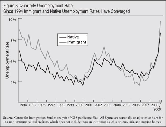 - In the second half of 2007 and into 2008 unemployment began to rise slightly faster for immigrants than for natives. By the first quarter of this year, immigrants had higher unemployment than natives.
