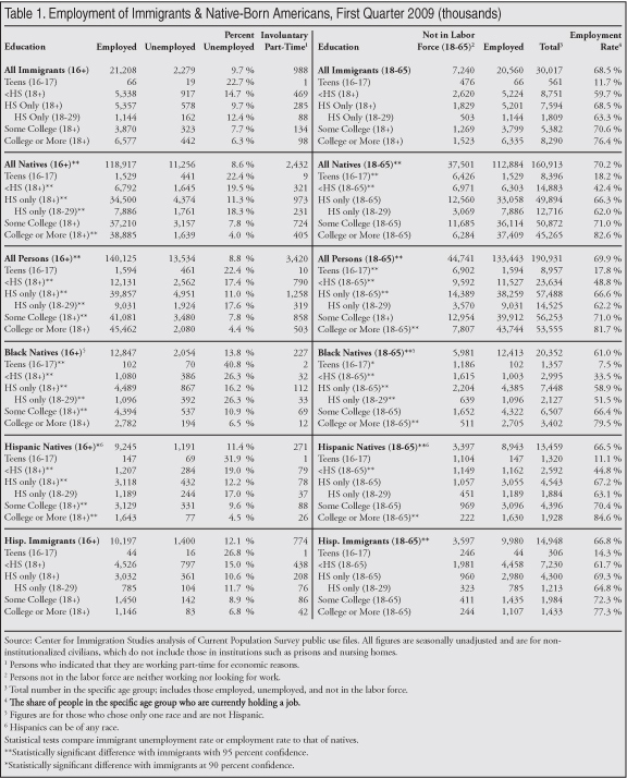 3 When looking at the overall employment picture, we follow the example of the Bureau of Labor Statistics and report figures for those 16 and older. When we examine employment by education we look at the18 and older population. We feel this makes sense because we are interested in unemployment for both younger and older people. However, particularly for those with more education, researchers sometimes examine only those 21 and older or 25 and older. For both immigrants and natives with the same education level the population 21 and older has almost exactly the same unemployment rate as the18 and older population. If we use the 25 and older population, among more educated immigrants, their unemployment rate is also very similar to the 18 and older population. Among natives the rates are slightly lower. For example, among natives 25 and older in the first quarter of 2009, the unemployment rate was 7.4 percent for those with some college and 3.8 percent for those with at least a college degree. This compares to 7.8 and 4.0 percent (see Table 1) for these two groups when we examine the 18 and older population. Thus the more educated natives do have slightly lower unemployment when we confine our analysis to only those 25 and older. This in turn makes the gap with immigrants slightly larger. But the differences are still small and by looking at the 18+ population we are able to incorporate unemployment statistics for young workers into our educational analysis.
